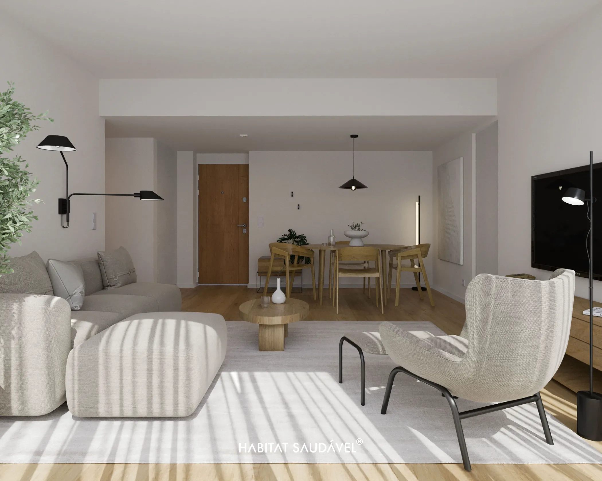O principal desafio foi criar um lar confortável e acolhedor que fosse minimalista, masculino, sofisticado e acima de tudo muito funcional. Optamos por uma linguagem cromática neutra (para ampliar as áreas reduzidas) combinada com cerca de 45% de superfícies em madeira que, segundo alguns estudos de NeuroArquitetura, tornar os ambientes mais harmoniosos e humanos.